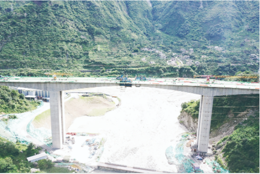 金光特大橋是瀘石高速公路全線控制性工程之一,該橋全長450米,最高墩高67米,位于甘孜州瀘定縣得妥鎮(zhèn)金光村境內(nèi)。大橋所在位置海拔高度1105米,年均氣溫15.7℃,晝夜溫差大,混凝土膠凝材料施工質(zhì)量要求高。此外,金光特大橋跨越得妥鎮(zhèn)磨西河,該河谷為瀘定縣典型泥石流沖溝,總體施工技術(shù)難度偏大。