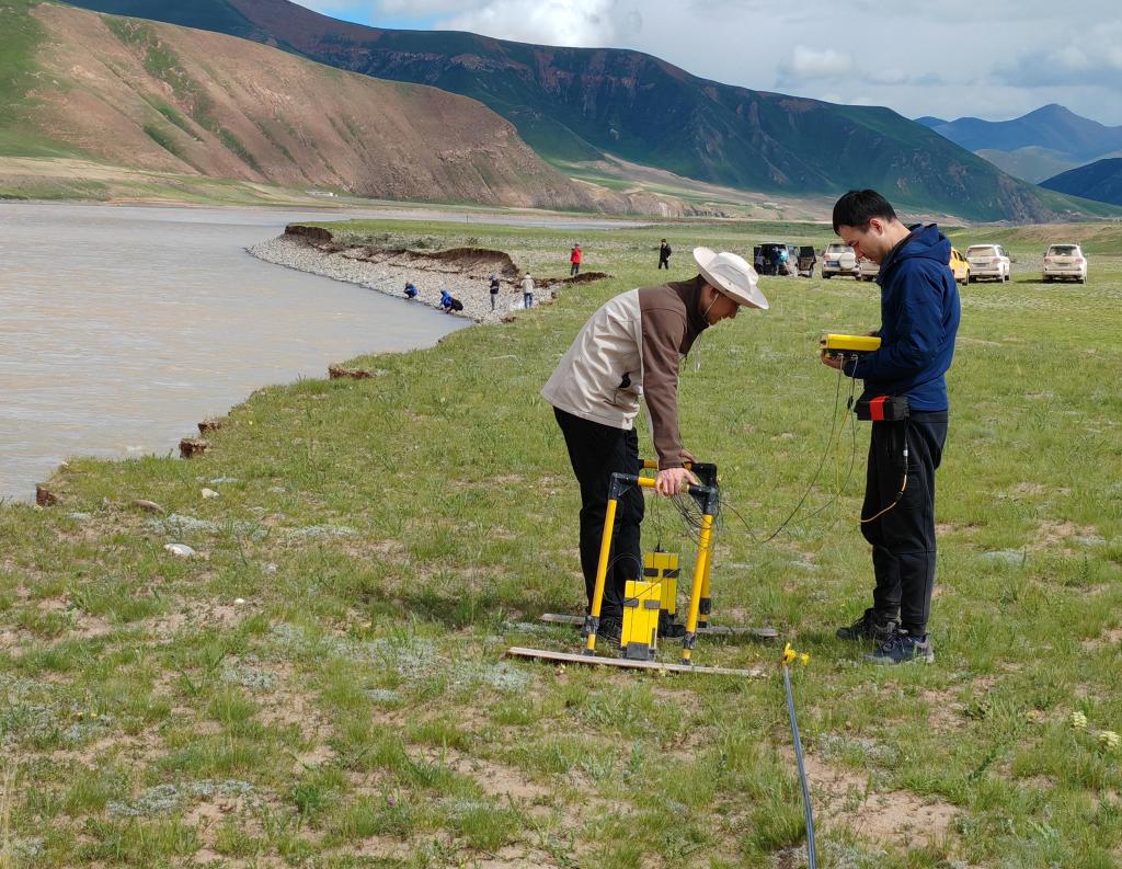 7月25日,范越(前左)和董士琦在長江上游干流通天河畔開展地質(zhì)雷達探測。(受訪者供圖)