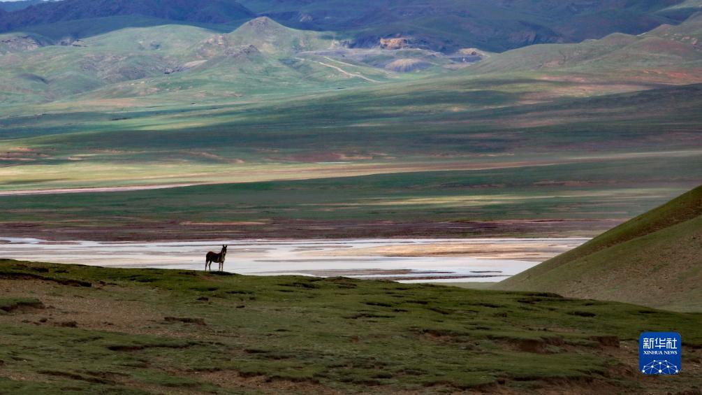 通天河支流辮狀河道旁的藏野驢(7月26日攝,無人機照片)。新華社記者 劉詩平 攝