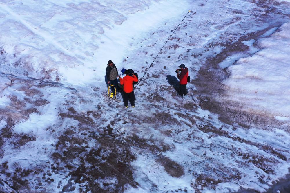 科考隊員在冰面上使用地質(zhì)雷達(dá)探測冬克瑪?shù)妆ê穸龋?月27日攝)。新華社記者 陳杰 攝