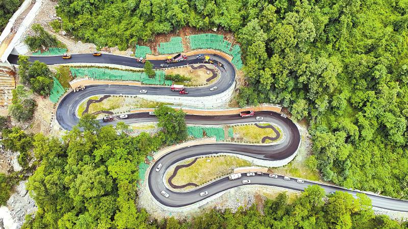 隨著道路基本修復(fù)完成,多個(gè)路段正進(jìn)行瀝青路面鋪筑。俯瞰視角中,黑色的旅游公路盤(pán)山而上,逶迤山間。據(jù)介紹,海螺溝景區(qū)道路不是簡(jiǎn)單重建,而是恢復(fù)提升,全線(xiàn)按三級(jí)公路標(biāo)準(zhǔn)建設(shè),路基全部拓寬至7.5米,并鋪設(shè)瀝青混凝土路面;部分急彎陡坡段進(jìn)行了改善,提升了觀(guān)景臺(tái)、護(hù)欄的安全等級(jí),行車(chē)舒適度大為提升。
