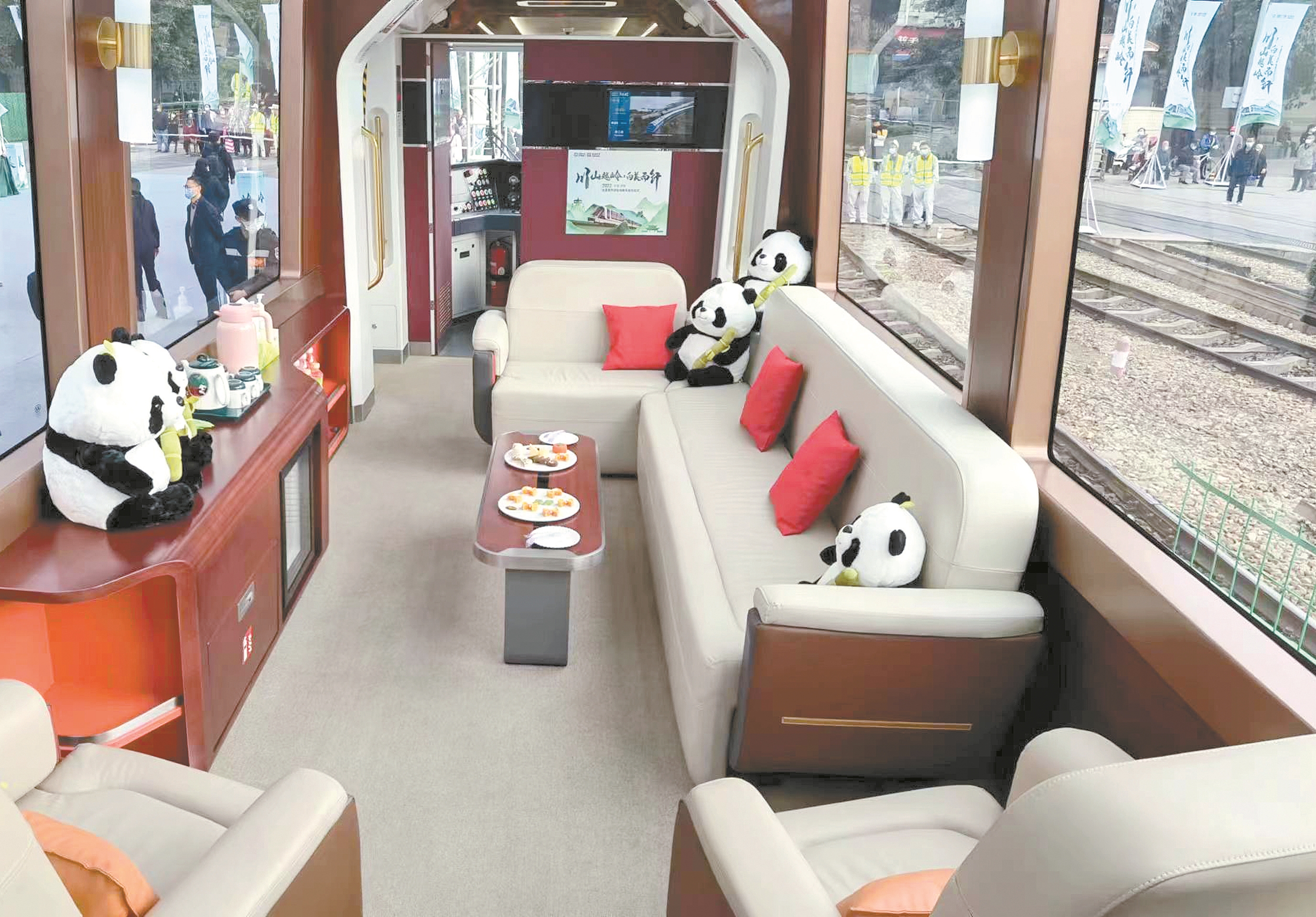 “列車采用4節(jié)編組,額定載客數(shù)145人,內(nèi)飾分為豪華VIP家庭式包廂、豪華觀光卡座區(qū)、普通座區(qū)三種座位區(qū),滿足乘客多種乘車需求。它還具有國內(nèi)最大面積曲面觀光玻璃窗,可實(shí)現(xiàn)車內(nèi)游客與自然景觀的深度交流。”相關(guān)負(fù)責(zé)人向記者介紹道。