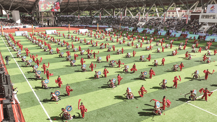 來(lái)自四川省藏文學(xué)校的小伙們熱情奔放、姑娘們可愛(ài)生姿,由他們共同演繹的這支青春動(dòng)感熱身操,瞬時(shí)點(diǎn)燃體育場(chǎng)氣氛,9000余雙眼睛注視著全場(chǎng)刮起的這輪“最炫民族風(fēng)”,觀眾席掌聲雷動(dòng)、歡呼聲響徹。