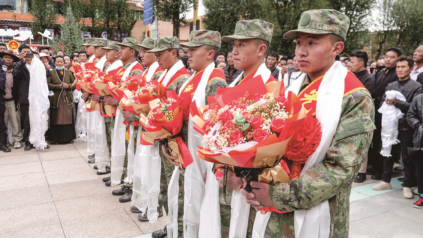 新兵們精神抖擻、氣宇軒昂,身著軍裝、胸戴大紅花和家鄉(xiāng)父老敬獻(xiàn)的潔白哈達(dá),在格薩爾廣場(chǎng)整裝出發(fā),滿懷豪情,踏上報(bào)效國(guó)家的新征程,展現(xiàn)出新時(shí)代青年積極響應(yīng)祖國(guó)號(hào)召,矢志報(bào)國(guó)的精神風(fēng)貌。