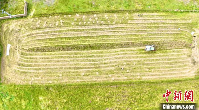 圖為無(wú)人機(jī)航拍村民搶收黑青稞。曹民鍇 攝