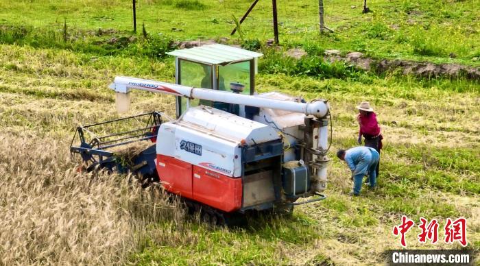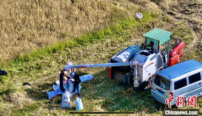圖為無(wú)人機(jī)航拍收割機(jī)作業(yè)。曹民鍇 攝