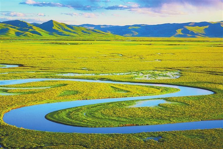 黃河首曲,阿萬(wàn)倉(cāng)濕地,綠毯似的草地一望無(wú)際,支流如飄帶般蜿蜒其間。