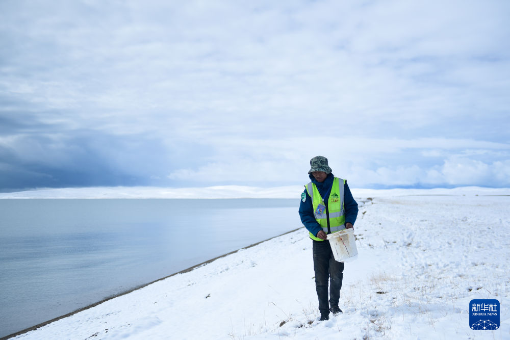 2021年10月20日,在青海省果洛藏族自治州瑪多縣扎陵湖鄉(xiāng)勒那村,三江源國家公園黃河源園區(qū)生態(tài)管護員在扎陵湖邊撿拾垃圾。新華社記者張龍 攝