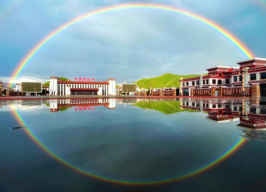 9月18日,彩虹下的滇藏鐵路麗香段香格里拉站。(中國(guó)鐵路昆明局集團(tuán)公司供圖)