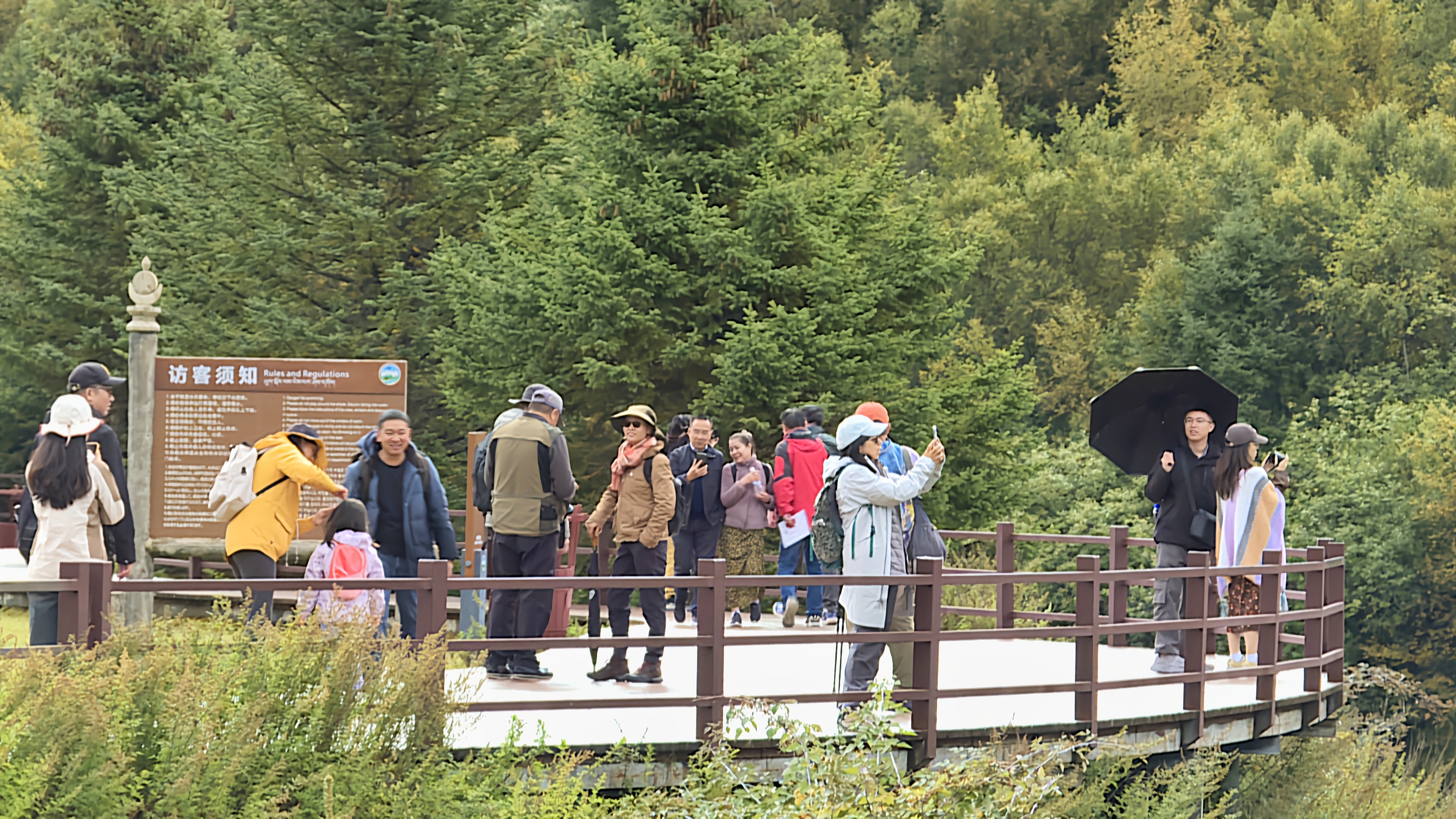 秋日的普達(dá)措國家公園層林盡染、色彩斑斕,高山草甸、原始森林與湖泊濕地構(gòu)成了一幅幅美麗的畫卷,屬都湖棧道上人群熙熙攘攘?!拔沂堑谝淮蝸硐愀窭锢糜危愀窭锢o我的感覺就是,這里的生態(tài)環(huán)境保護(hù)得很好,綠水青山,很值得來游玩。”游客宋女士表示。