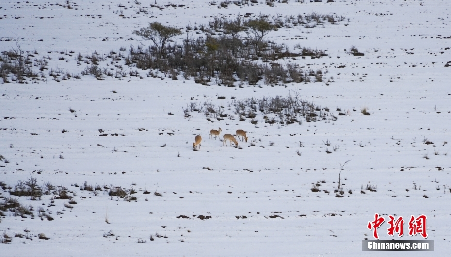 10月12日,四只普氏原羚在青海湖北岸雪中覓食。當(dāng)日,在青海湖北岸的青海省海北藏族自治州剛察縣哈爾蓋“羚羊小鎮(zhèn)”,成群的普氏原羚在雪中覓食、漫步。普氏原羚是世界瀕危物種、國家一級重點(diǎn)保護(hù)野生動(dòng)物,現(xiàn)僅分布于青海湖周圍,成為青海湖獨(dú)有的珍稀有蹄類動(dòng)物和旗艦物種。中新社記者 馬銘言 攝