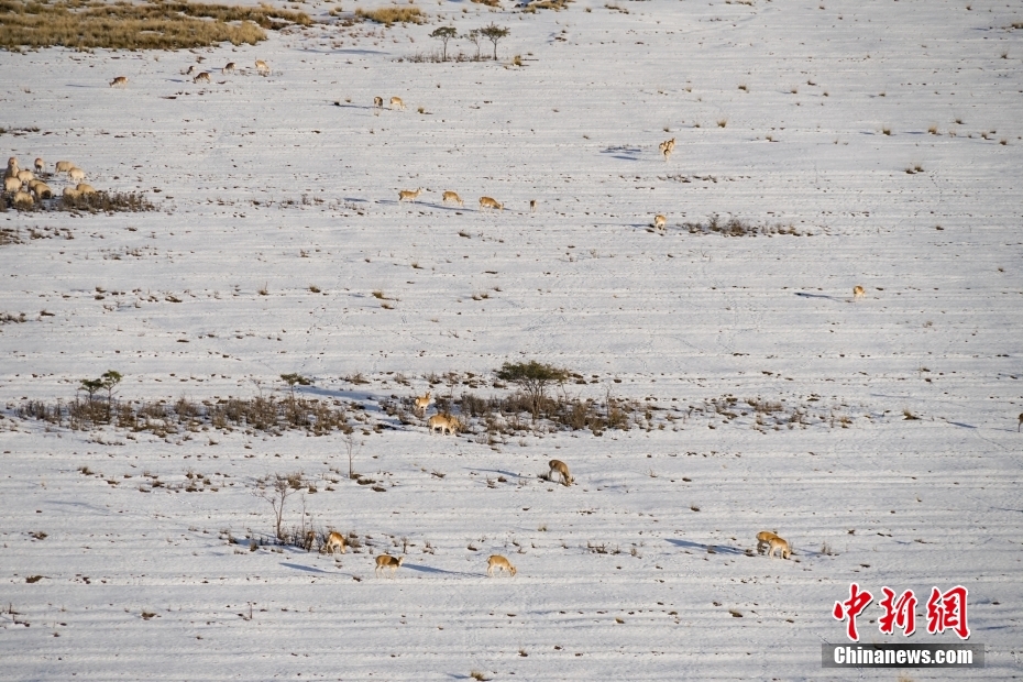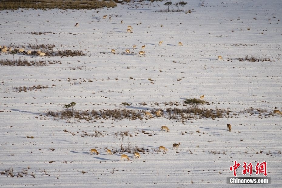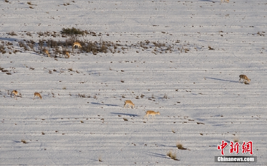 10月12日,成群普氏原羚在青海湖北岸雪中覓食、漫步。當(dāng)日,在青海湖北岸的青海省海北藏族自治州剛察縣哈爾蓋“羚羊小鎮(zhèn)”,成群的普氏原羚在雪中覓食、漫步。普氏原羚是世界瀕危物種、國家一級重點(diǎn)保護(hù)野生動(dòng)物,現(xiàn)僅分布于青海湖周圍,成為青海湖獨(dú)有的珍稀有蹄類動(dòng)物和旗艦物種。中新社記者 馬銘言 攝