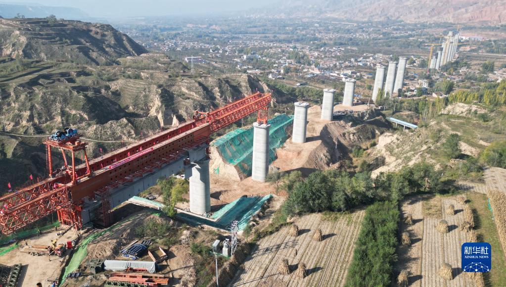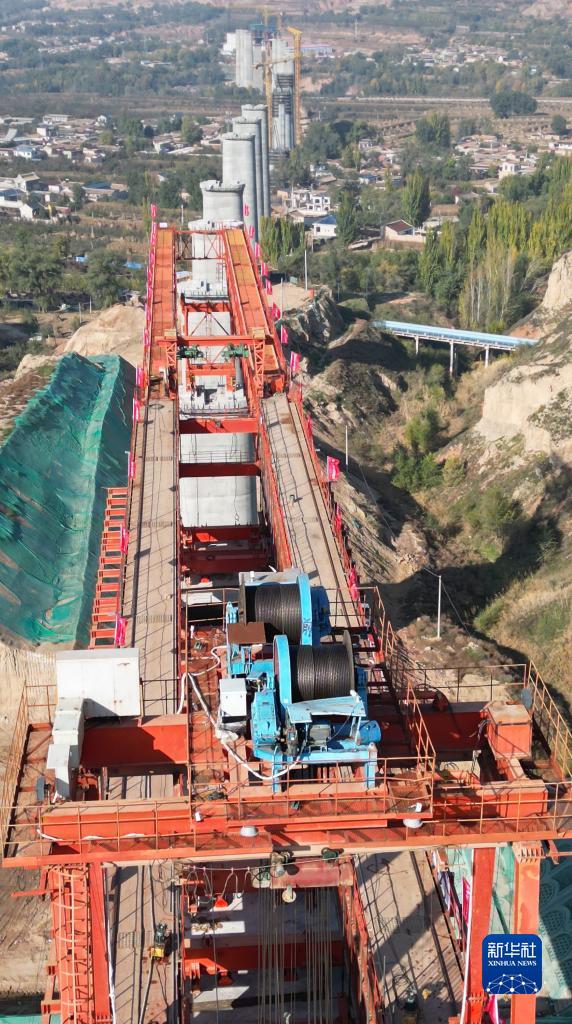 10月24日拍攝的位于甘肅臨夏境內(nèi)的蘭合鐵路4標(biāo)段泄湖峽大夏河特大橋膠拼梁架設(shè)施工現(xiàn)場(無人機(jī)照片)。新華社 史有東 攝