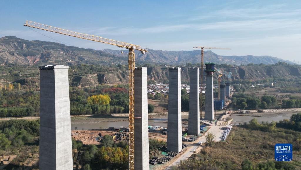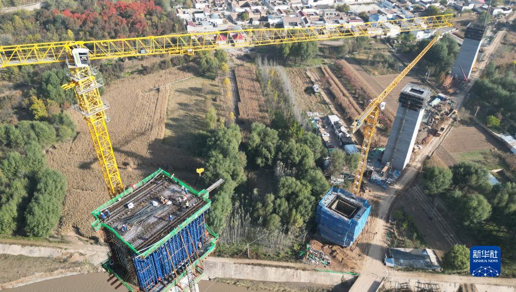 這是10月24日拍攝的位于甘肅臨夏境內(nèi)的蘭合鐵路4標(biāo)段北小塬大夏河特大橋墩身施工現(xiàn)場(無人機(jī)照片)。新華社 史有東 攝