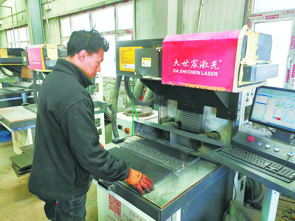 工人在石刻廠操作激光石刻機。