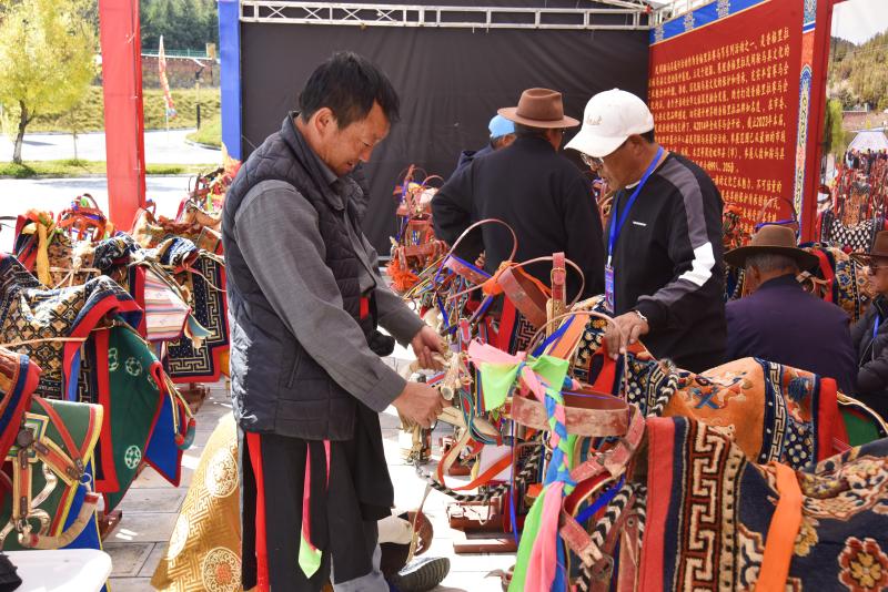 香格里拉市建塘鎮(zhèn)的民間藝人七林定主是鞍馬具制作能手,此次他帶著自己制作的8套鞍馬具來到交流活動(dòng)現(xiàn)場(chǎng)參展。他說:“我制作鞍馬具已經(jīng)25年了,希望能通過這次交流活動(dòng)將香格里拉的鞍馬具文化展示給外地友人?!?/p>