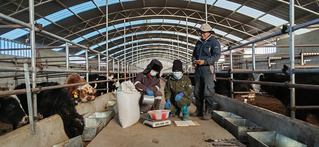 蘭州大學(xué)生態(tài)學(xué)院博士后景小平(右一)和團(tuán)隊(duì)人員正在為牦牛配比飼料。新華社記者文靜 攝