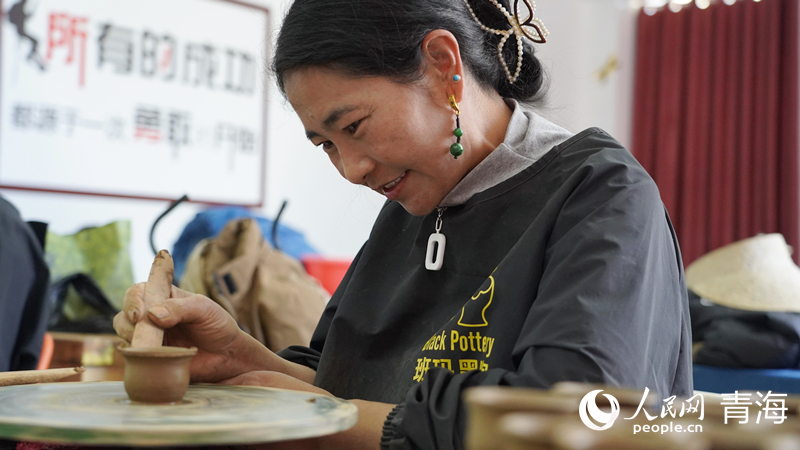 “在這兒既能在老師的指導(dǎo)下免費學(xué)到黑陶制作技藝,還能帶孩子。”青海省果洛藏族自治州班瑪縣瑪可河鄉(xiāng)牧民金措正在打磨一件黑陶器皿,姑娘就坐在旁邊,時而玩泥巴,時而喝牛奶,一雙大眼睛好奇地觀察著四周。