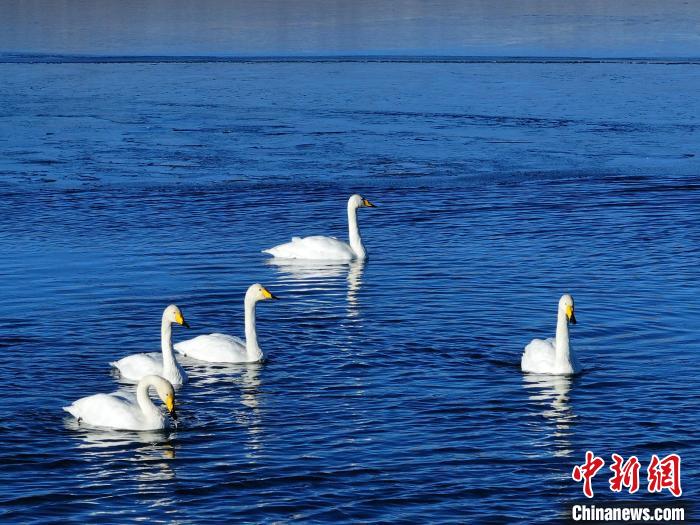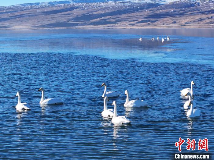 圖為成群大天鵝在青海湖中游弋休憩。包雷 攝