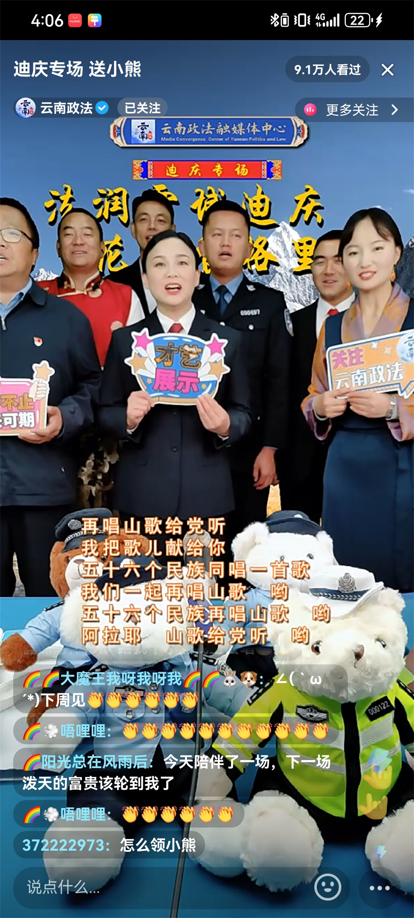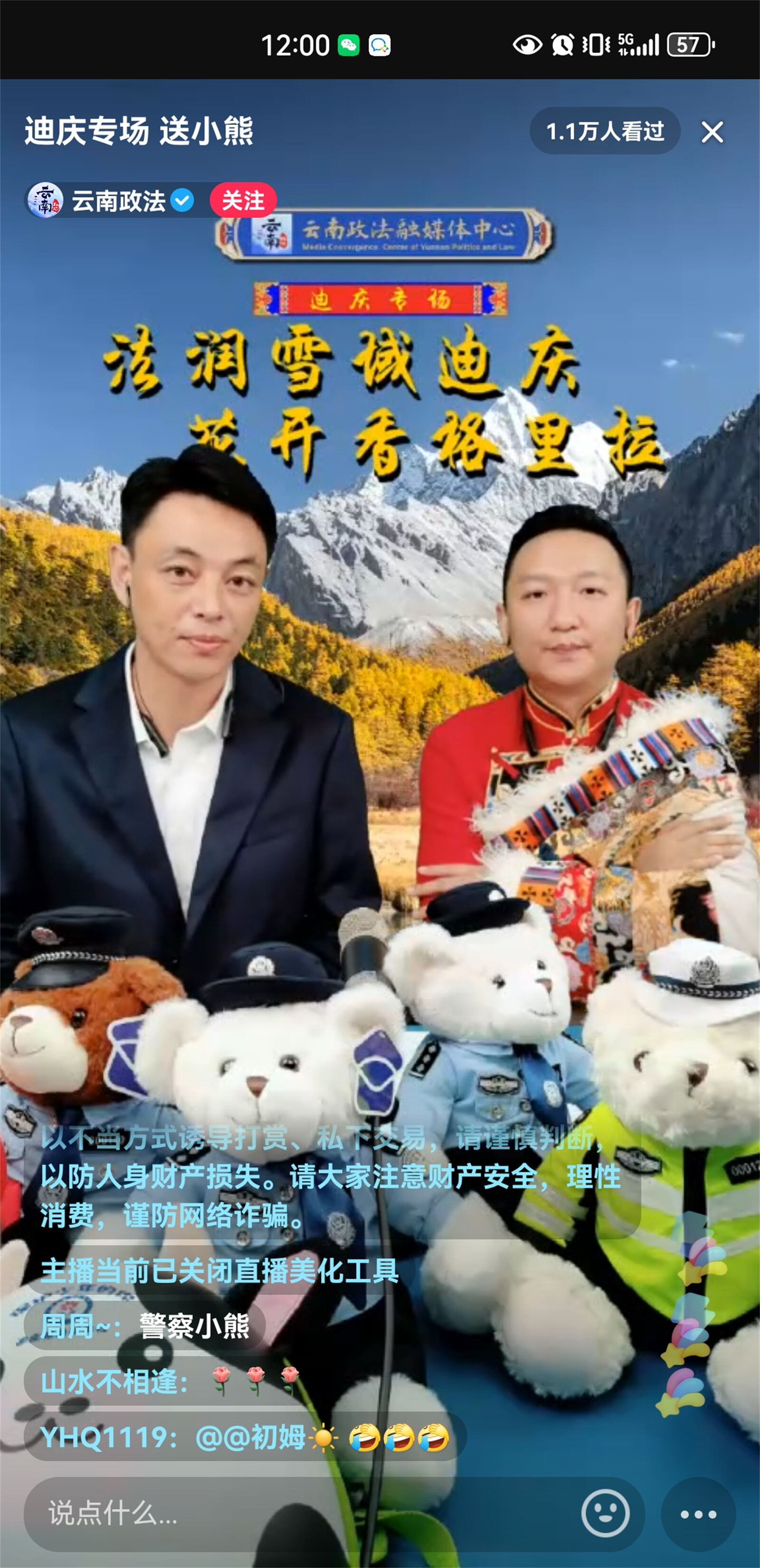 近日,迪慶州政法干警走進云南政法普法強基直播間開展“法潤雪域迪慶、花開香格里拉”迪慶州普法專場直播,直播聚焦群眾關切,緊密聯系時事熱點,帶廣大網友體驗了一場內容豐富的普法之旅,共吸引9.1萬人觀看,獲點贊超10.4萬。