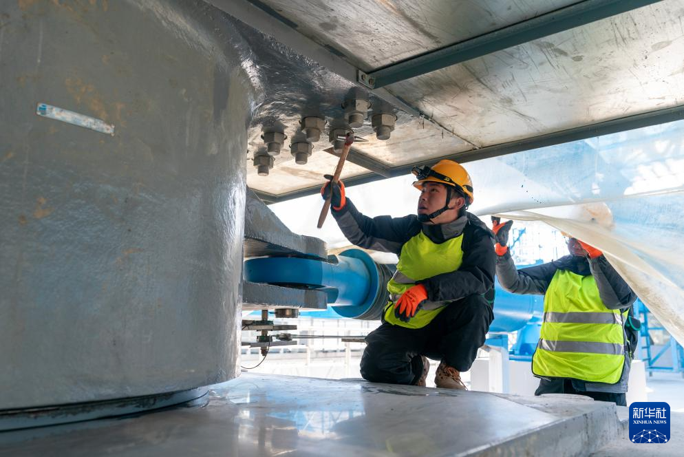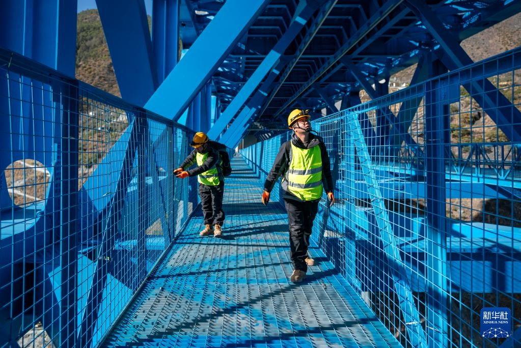 1月24日,工區(qū)職工趙澗泉(左)、羅星海在查看大橋阻尼器。新華社記者 陳欣波 攝