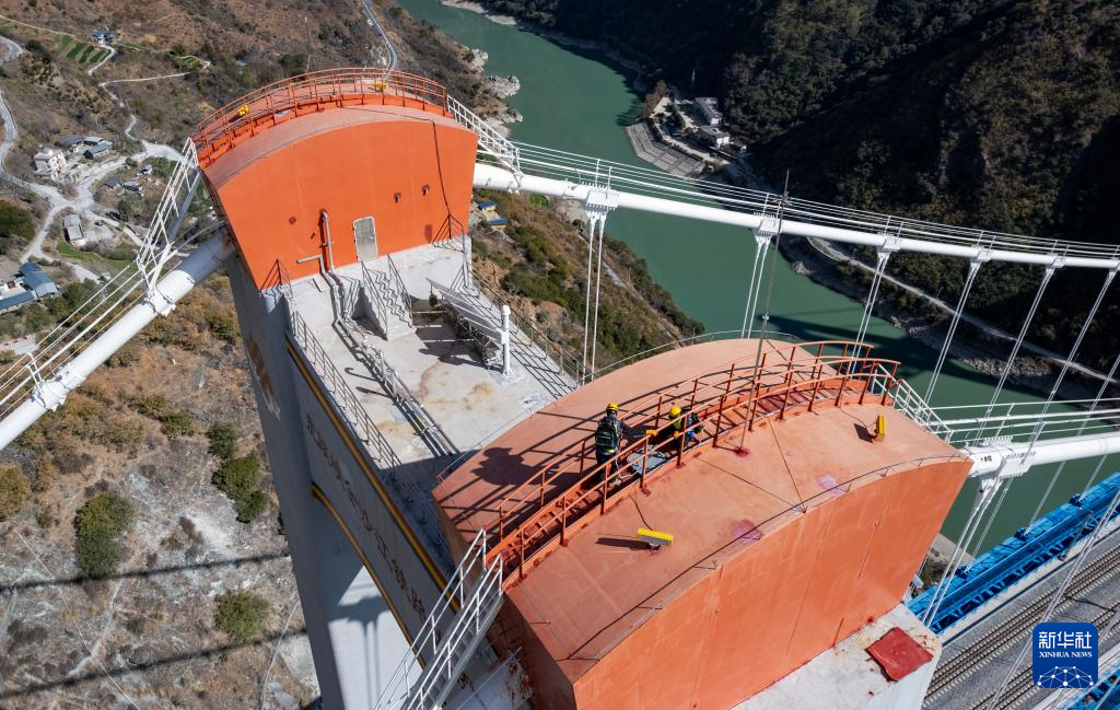 1月24日,工區(qū)職工劉榕基和工區(qū)班長楊應(yīng)文在主纜巡檢。新華社記者 陳欣波 攝