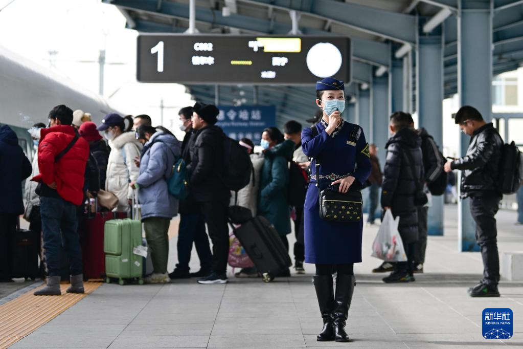 1月30日,中國鐵路青藏集團(tuán)有限公司西寧客運(yùn)段動車隊(duì)乘務(wù)員王璐在站臺提示旅客登車。新華社記者 張龍 攝