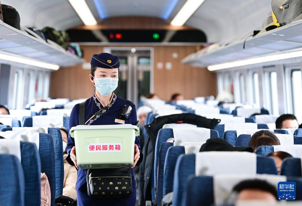 1月30日,中國鐵路青藏集團(tuán)有限公司西寧客運(yùn)段動車隊(duì)乘務(wù)員王璐在為旅客服務(wù)。新華社記者 張龍 攝
