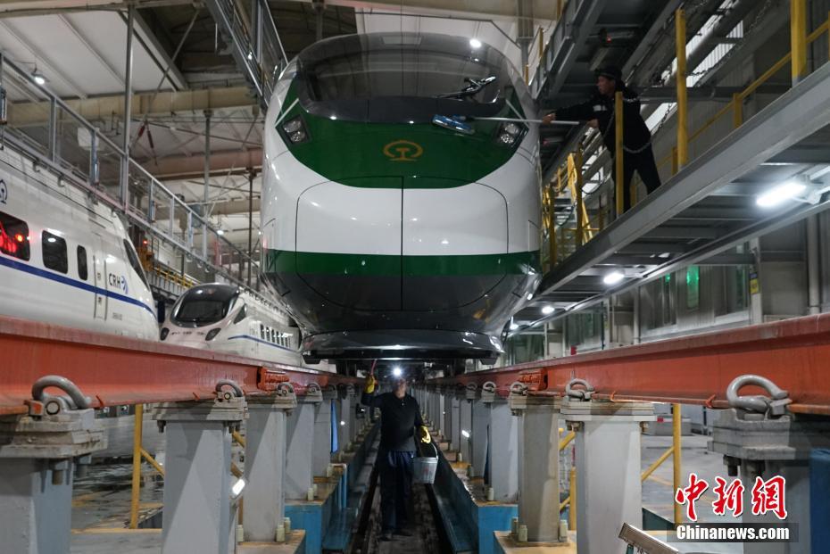 1月30日晚,在青藏鐵路公司西寧車輛段動(dòng)車運(yùn)用車間,地勤機(jī)械師在無電作業(yè)時(shí)進(jìn)行動(dòng)車組走行部關(guān)鍵部位的檢修。中新社記者 馬銘言 攝