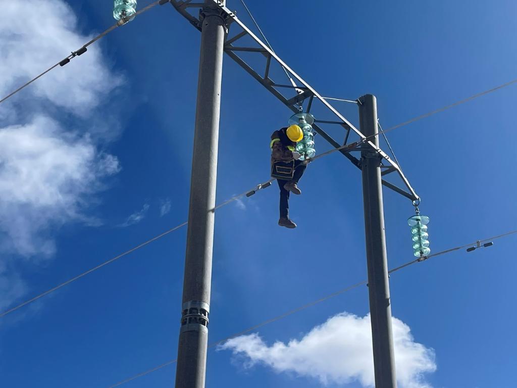 一趟列車呼嘯而過,職工們站在圍欄外靜靜地等待調(diào)度命令。沒過多久,對講機(jī)里傳來值班員彭敬成傳達(dá)的調(diào)度命令“停電命令已下達(dá),可以接掛地線,準(zhǔn)備開始作業(yè)。”隨著停電命令的下達(dá),大家開始了緊張有序的集中檢修工作。