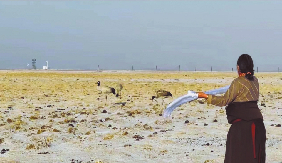 如科分享的視頻顯示,3月13日,雪后的若爾蓋銀裝素裹,獵獵的風(fēng)吹動(dòng)著如科房上的旗幟,四只黑頸鶴在黃色的草堆旁游走覓食。由他們精心照料的黑頸鶴夫婦,攜帶著兩只逐漸長大的小鶴,成為今年首批回到若爾蓋濕地的種群。按照往年的慣例,如科的妻子為遠(yuǎn)道而來的“親人”送上哈達(dá)(如圖),歡迎它們回歸花湖。