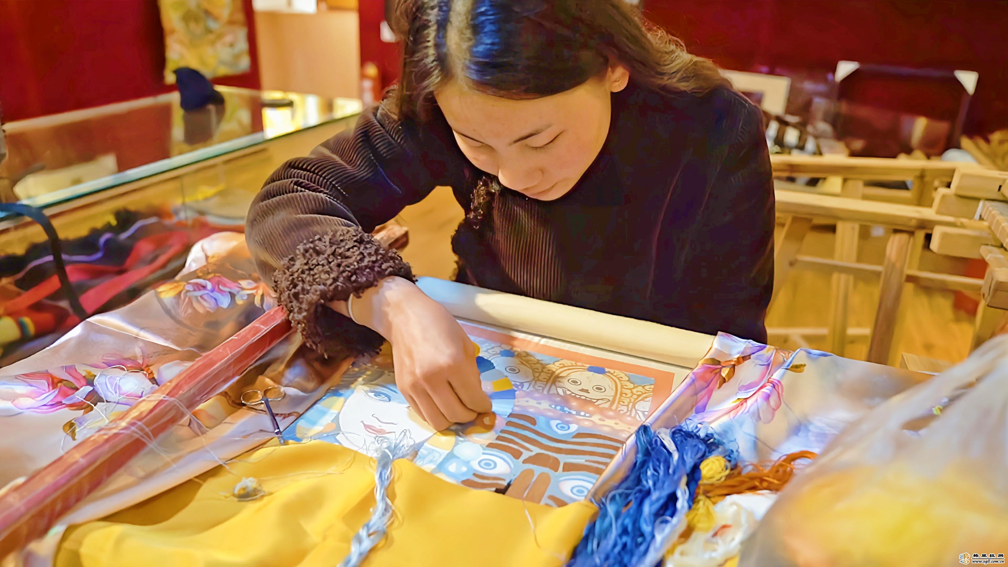 走進(jìn)位于獨(dú)克宗古城的香格里拉藏繡文化藝術(shù)院,一件件精美的手工藏繡作品陳列在展館內(nèi)。堆繡、盤(pán)金、打籽針?lè)ㄕ故境霾煌L(fēng)格的藏繡手法,細(xì)韌、明亮而又富有彈性的絲線使得繡品艷麗而有光澤,吸引著南來(lái)北往的游客前來(lái)參觀。