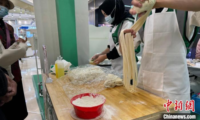 活動現(xiàn)場,人頭攢動,展示區(qū)展出拉面成品,可品嘗手工拉面,亦有牦牛肉干、甜醅等青海特色美食,相關從業(yè)人員“各顯神通”,吸引來往行人。