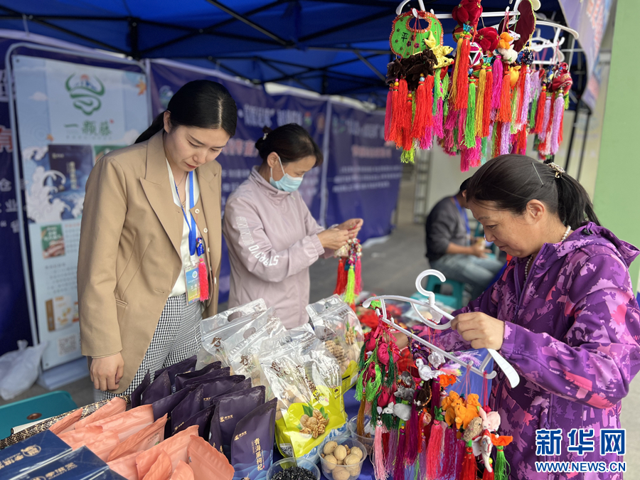 市民在賽場(chǎng)外非遺展示區(qū)挑選“青繡”掛件。新華網(wǎng) 魚昊 攝