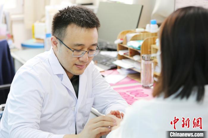 圖為5月17日拍攝的上海援青醫(yī)療人才、青海省中醫(yī)院院長(zhǎng)林勛(左)在“名醫(yī)工作室”問(wèn)診。張?zhí)砀?攝