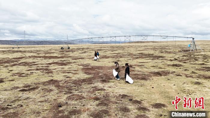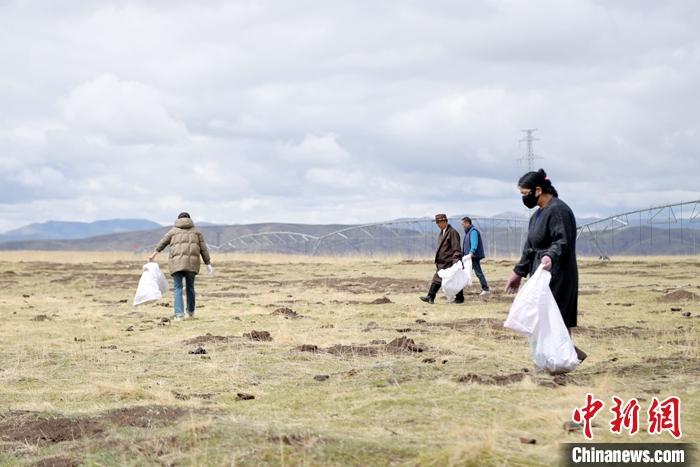圖為5月8日,卓瑪加布和當?shù)啬撩褡园l(fā)在草原上撿拾垃圾。 中新社記者 九美旦增 攝