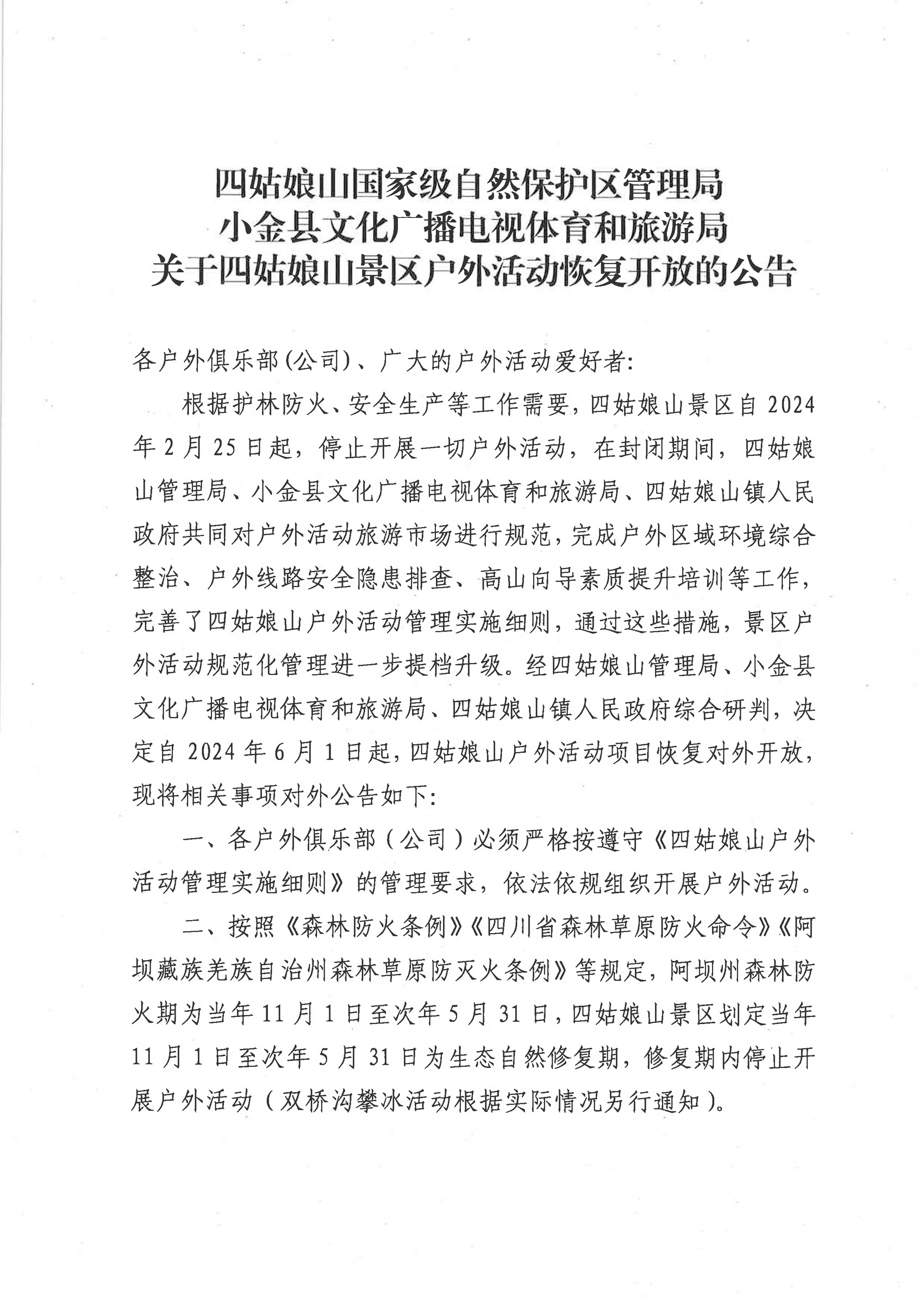 經(jīng)四姑娘山管理局、小金縣文化廣播電視體育和旅游局、四姑娘山鎮(zhèn)人民政府綜合研判,決定自2024年6月1日起,四姑娘山戶外活動(dòng)項(xiàng)目恢復(fù)對外開放。公告要求各戶外俱樂部(公司)必須嚴(yán)格遵守《四姑娘山戶外活動(dòng)管理實(shí)施細(xì)則》的管理要求,依法依規(guī)組織開展戶外活動(dòng)。