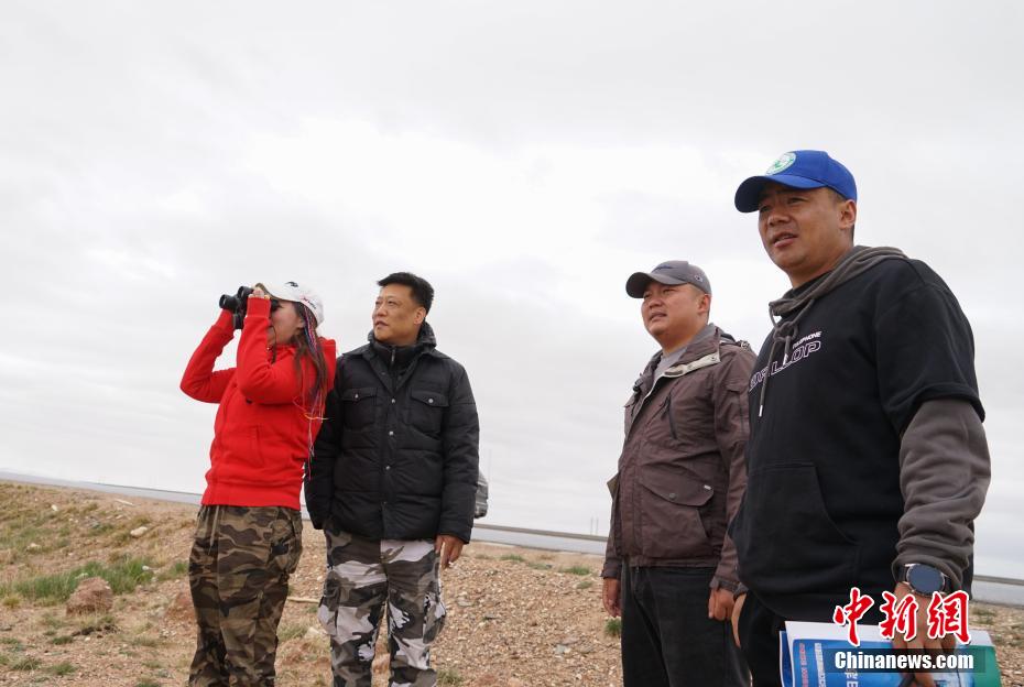 6月20日,在三江源國家公園長江源園區(qū)可可西里管理處索南達杰保護站附近,2名生態(tài)管護員(右一、右二)與游客眺望藏羚羊,并進行科普宣傳。中新社記者 馬銘言 攝