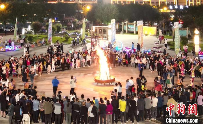 圖為冶力關(guān)洮州文化廣場上,每日晚間都有的篝火晚會。九美旦增 攝
