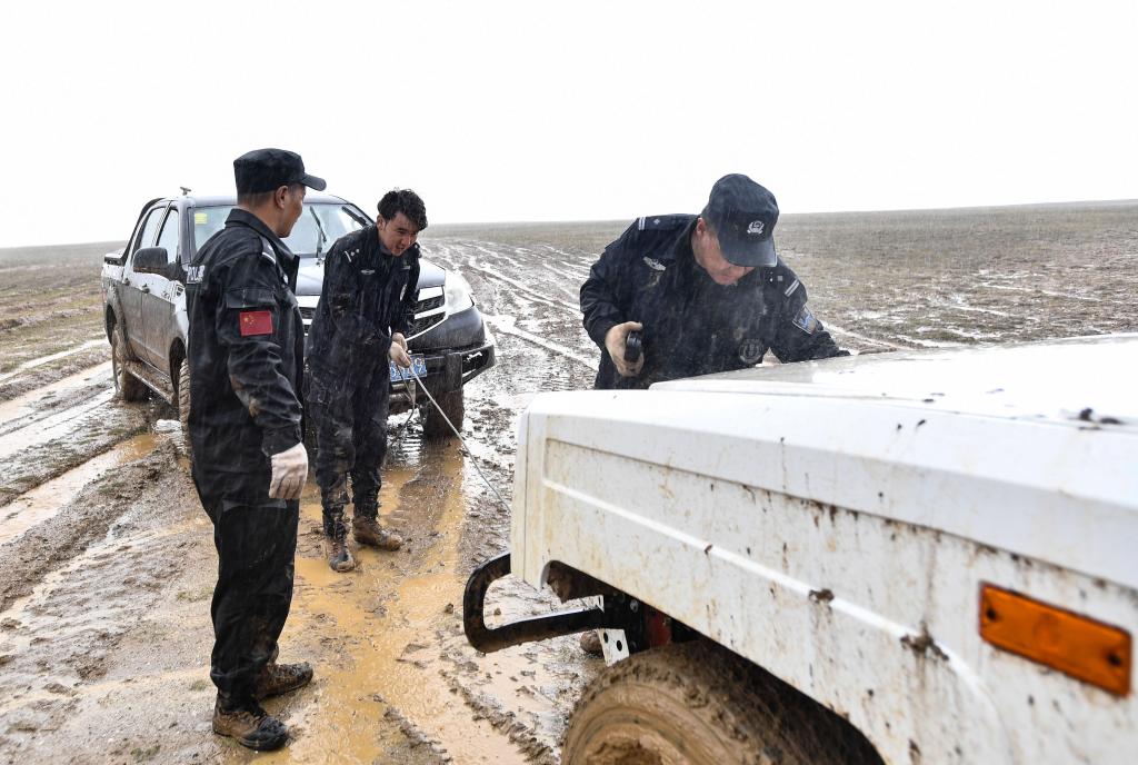 2020年7月6日,卓乃湖保護(hù)站站長秋培扎西(右)和巡山隊(duì)員更松多杰(左)、白瑪東周在可可西里地區(qū)冒雨拉車。新華社 張龍 攝