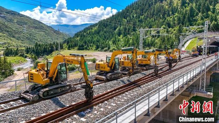 川青鐵路鎮(zhèn)黃段500米長(zhǎng)軌鋪設(shè)采用“直鋪法”和“換鋪法”相結(jié)合的方式組織施工,無(wú)砟道床采取“直鋪法”施工,有砟道床采取“換鋪法”施工,利用工具軌鋪通右線,作為工程路料運(yùn)輸主線,同時(shí)兼顧左線鋪軌、長(zhǎng)軌焊接鎖定及大機(jī)搗固穿插施工作業(yè)。“為確保鋪軌安全有序推進(jìn),專門配置了HXN5型高原大功率內(nèi)燃機(jī)車等80余臺(tái)(輛)大型設(shè)備開(kāi)展軌道施工作業(yè)?!睆埲A稱,期間項(xiàng)目部合理分配資源,5天完成100公里長(zhǎng)鋼軌鋪設(shè),12天完成100公里無(wú)縫線路單元焊接及放散鎖定工作。
