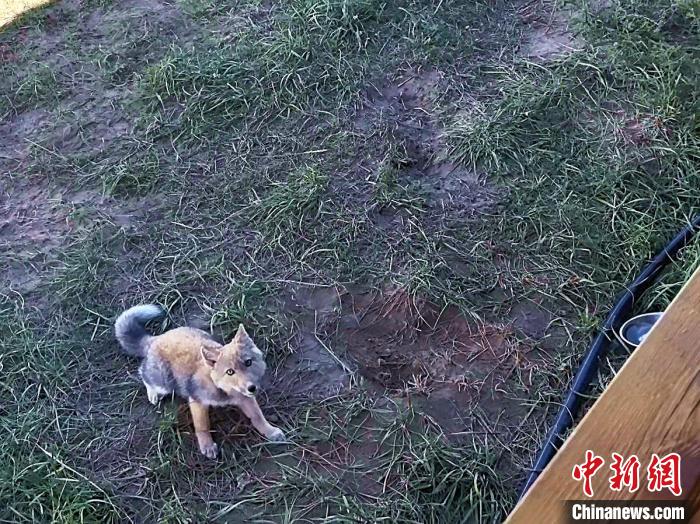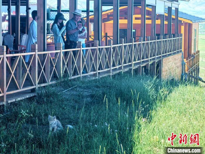圖為青海湖金沙灣景區(qū)廚師看著藏狐一家。中新社記者 李雋 攝