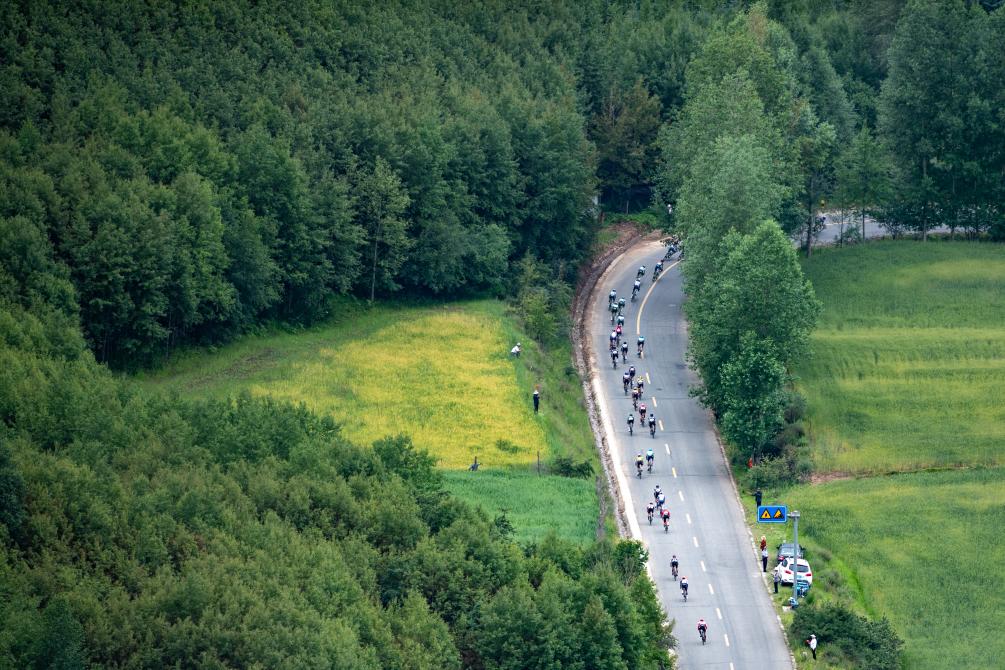 7月9日,參賽選手在第23屆環(huán)青海湖國(guó)際公路自行車(chē)賽第三賽段互助至貴德的比賽中騎行。新華社 潘彬彬 攝