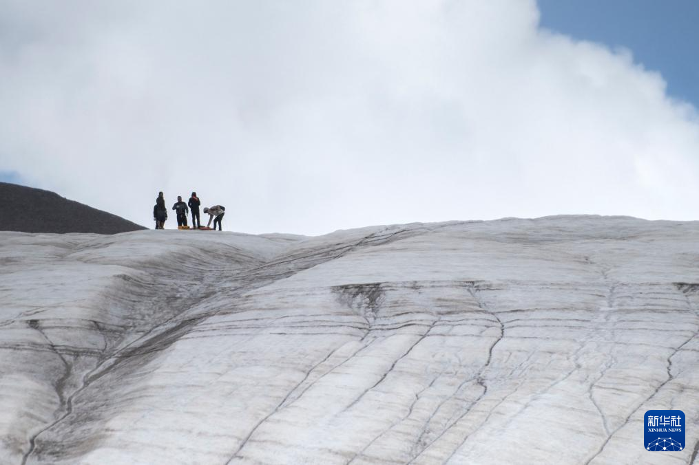 7月25日,在冬克瑪?shù)妆?,科考隊員在進行冰川厚度探測及冰儲量匡算工作。新華社記者 伍志尊 攝