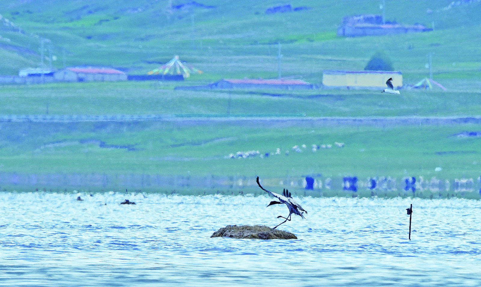 多杰措毛是泉灣保護站的一名生態(tài)管護員,在泉灣濕地尕日拉區(qū)域內(nèi),用望遠(yuǎn)鏡觀察湖面上一對正在孵育幼鳥的黑頸鶴,她回憶起今年跟著當(dāng)?shù)丨h(huán)保人士給黑頸鶴筑巢修巢的場景。