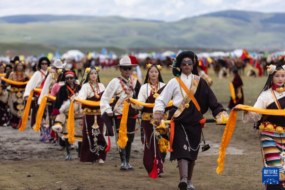 7月30日,在理塘縣多旺塘賽馬場,來自理塘縣高城鎮(zhèn)的方隊(duì)展示傳統(tǒng)民族服飾。新華社記者 江宏景 攝