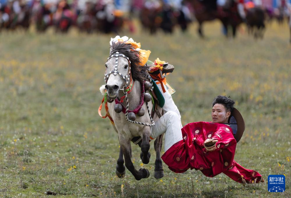 7月30日,四川省甘孜藏族自治州理塘“八一”賽馬會在多旺塘賽馬場啟幕,來自全縣各鄉(xiāng)鎮(zhèn)近千名牧民匯聚一堂。賽馬會上表演的拾哈達(dá)、馬上射擊、馬上射箭、鐙里藏身、五彩凌空等馬術(shù)絕技,讓當(dāng)?shù)啬撩窈陀慰拖硎芰艘粓鲆曈X盛宴。
