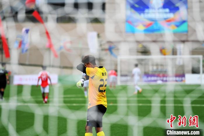 8月2日,云南迪慶州隊守門員在比賽中擦拭臉上的汗水。中新社記者 九美旦增 攝