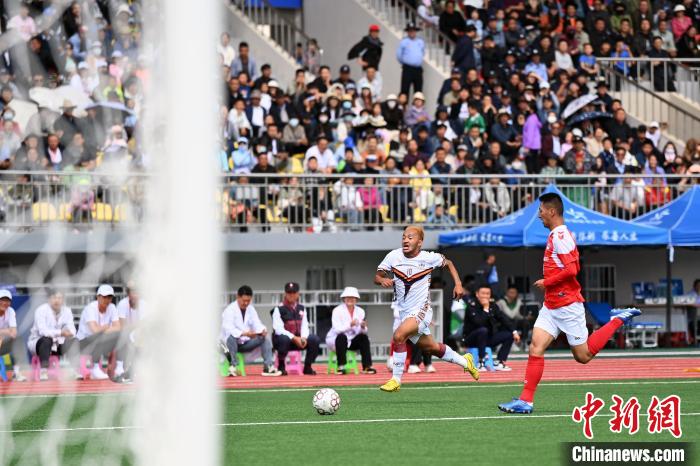 8月2日,甘肅甘南州隊球員(白)和云南迪慶州隊球員在比賽中。中新社記者 九美旦增 攝