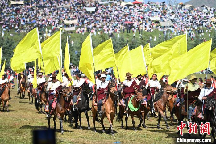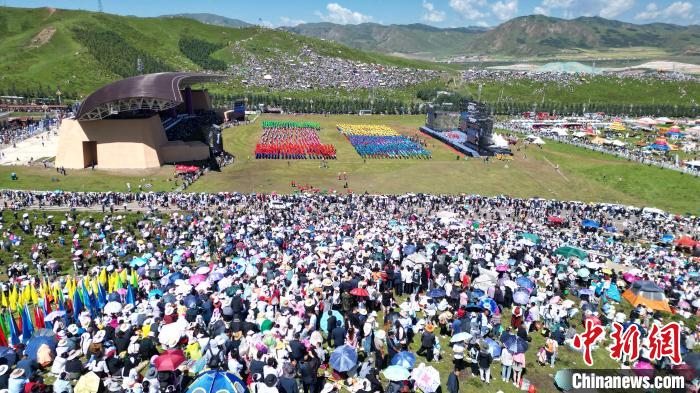 8月4日,第22屆九色甘南香巴拉旅游藝術(shù)節(jié)在甘肅省甘南藏族自治州當(dāng)周草原開幕。人們身著節(jié)日盛裝載歌載舞、歡聚一堂,馬隊(duì)巡游、千人鍋莊舞等活動(dòng)精彩上演。九色甘南香巴拉旅游藝術(shù)節(jié)既是民眾浪山聚會(huì)的節(jié)日盛會(huì),也是展現(xiàn)發(fā)展成就、擴(kuò)大對(duì)外開放的重要窗口,更是展示民俗文化、促進(jìn)廣泛交往交流交融的有效載體。(無人機(jī)照片)中新社記者 九美旦增 攝